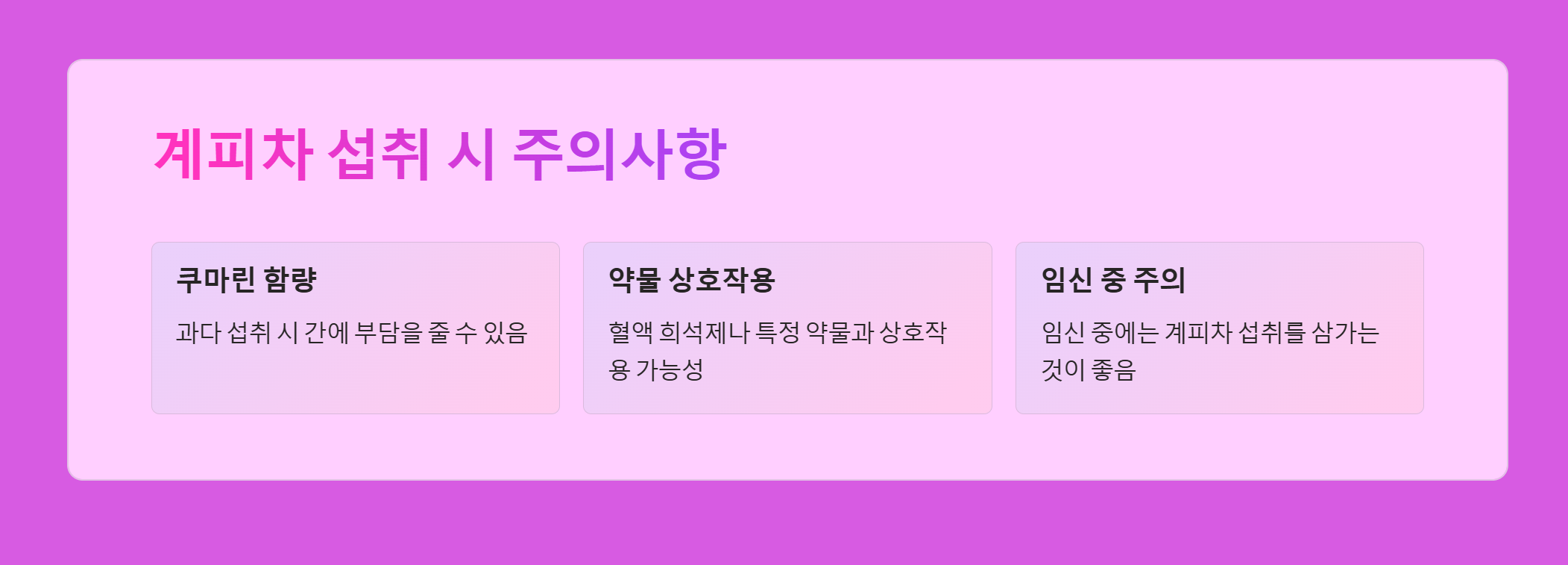 ๋ชจ๋ ๊ฑด๊ฐ์ํ๊ณผ ๋ง์ฐฌ๊ฐ์ง๋ก ๊ณํผ์ฐจ๋ ๊ณผ๋ค ์ญ์ทจ ์ ์ฃผ์ํด์ผ ํฉ๋๋ค. ํนํ ๊ณํผ์๋ ์ฟ ๋ง๋ฆฐ์ด๋ผ๋ ์ฑ๋ถ์ด ๋ค์ด ์๋๋ฐ, ์ด๋ ๊ณผ๋ค ์ญ์ทจ ์ ๊ฐ์ ๋ถ๋ด์ ์ค ์ ์์ต๋๋ค. ๋ํ, ํ์ก ํฌ์์ ๋ ํน์ ์ฝ๋ฌผ์ ๋ณต์ฉ ์ค์ธ ๊ฒฝ์ฐ, ๊ณํผ์ฐจ๊ฐ ์ฝ๋ฌผ์ ํจ๊ณผ๋ฅผ ๋ฐฉํดํ ์ ์์ผ๋ฏ๋ก ์ฃผ์๊ฐ ํ์ํฉ๋๋ค. ์ฌ์ฑ์ ๊ฒฝ์ฐ ์์ ์ค์๋ ๊ณํผ์ฐจ ์ญ์ทจ๋ฅผ ์ผ๊ฐ๋ ๊ฒ์ด ์ข์ต๋๋ค.